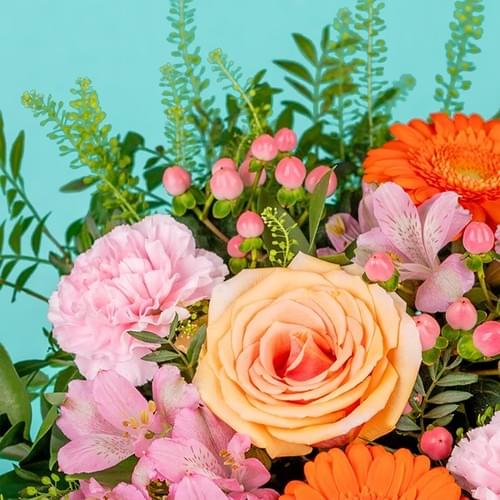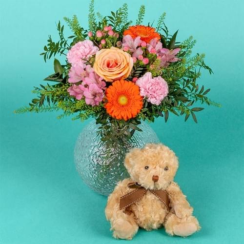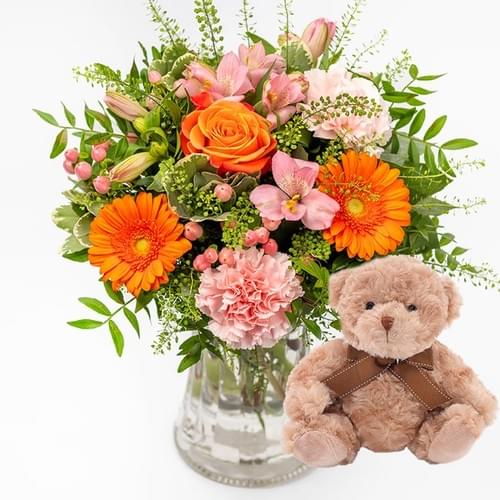 A bouquet with roses, germini, and carnations combined with seasonal greenery. With its shades of coral and pink, this bouquet is a true mood booster. Along with the flowers, we include a sweet teddy bear. The bouquet is an exclusive piece of floristry, with flowers carefully selected to ensure high quality. Each bouquet is unique and created based on assortment and season, while always maintaining its color and shape. The bouquet is delivered by a local florist.