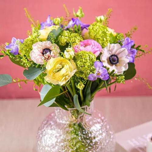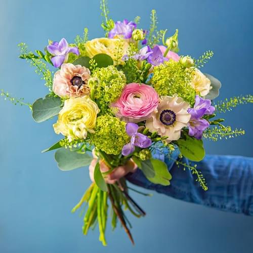 Let our florists create a beautiful spring bouquet filled with the season's most stunning flowers in lovely pastel tones. Ranunculus, tulips, anemones, and santinis... exactly which flowers your bouquet will feature is a delightful surprise. This bouquet is perfect when you want to send a gift that impresses. As beautiful as it is affordable.